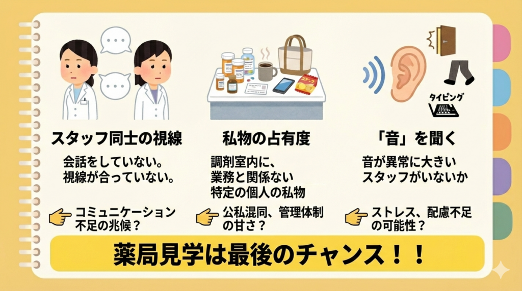 - 私物の占有度: 調剤室内に、業務と関係ない特定の個人の私物(ぬいぐるみ、特定のお菓子、私設の棚)が溢れていないか。これはその空間が「私物化」されているサインです。
